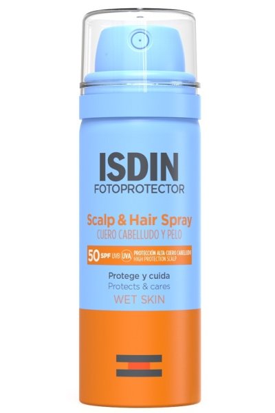 Protezione alta cuoio capelluto. Fotoprotettore in spray per il cuoio capelluto SPF50.