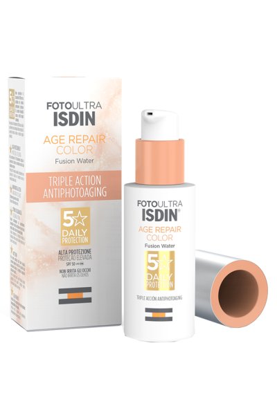 Fotoprotezione viso ultraleggera formulata in fase acquosa che in più ha una triplice azione antiage: protegge con un SPF50, ripara il danno solare accumulato e rigenera la pelle. Anche in versione colorata. Contiene pigmenti colorati che si adattano all’incarnato, uniformando e matificando la pelle.