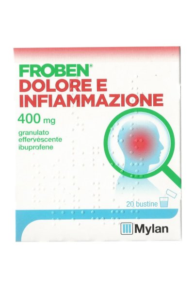 PosologiaPosologia Gli effetti indesiderati possono essere minimizzati con l’uso della dose minima efficace per la durata di trattamento più breve possibile necessaria per controllare i sintomi (vedere paragrafo 4.4). La dose di ibuprofene dipende dall’età e dal peso corporeo del paziente. La singola dose massima giornaliera per i pazienti adulti e adolescenti non deve superare gli 400 mg di ibuprofene. Adulti e adolescenti sopra i 12 anni (≥ 40 kg) 400 mg somministrati in dose singola o fino a 3 volte al giorno ad intervalli di 4–6 ore. Più di 400 mg a volta non forniscono un miglior effetto analgesico. La dose massima giornaliera non deve superare 1200 mg. Adolescenti Nel caso in cui l’uso del medicinale sia necessario per più di 3 giorni negli adolescenti, o nel caso di peggioramento della sintomatologia deve essere consultato il medico. Adulti Il paziente deve consultare il medico se i sintomi peggiorano o persistono per più di 3 giorni in caso di febbre e 5 giorni in caso di dolore. Popolazione pediatrica FROBEN DOLORE E INFIAMMAZIONE 400 mg Granulato Effervescente non è adatto per bambini di età inferiore a 12 anni. Per questa popolazione esistono altre formulazioni a base di ibuprofene più adatte. Anziani I FANS devono essere utilizzati con particolare cautela nei pazienti anziani che sono più soggetti a eventi avversi (vedere paragrafi 4.4 e 4.8). Se il trattamento è considerato necessario, occorre somministrare la dose minima per il più breve periodo di tempo necessario a controllare i sintomi. Il trattamento deve essere rivalutato a intervalli regolari e sospeso se non si osserva alcun beneficio o se si sviluppa intolleranza. Compromissione della funzionalità renale Nei pazienti con riduzione da lieve a moderata della funzionalità renale, la dose deve essere mantenuta al livello più basso possibile per il periodo più breve necessario a controllare i sintomi; la funzionalità renale deve essere monitorata. (Per i pazienti con grave insufficienza renale, vedere paragrafo 4.3). Compromissione della funzionalità epatica Nei pazienti con riduzione da lieve a moderata della funzionalità epatica, la dose deve essere mantenuta al livello più basso possibile per il periodo più breve necessario a controllare i sintomi. (Per i pazienti con grave insufficienza epatica, vedere paragrafo 4.3). Modo di somministrazione Al fine di raggiungere un più rapido inizio dell’azione, la dose può essere assunta a stomaco vuoto. Nei pazienti con sensibilità gastrica si raccomanda di assumere ibuprofene con il cibo. Il granulato effervescente deve essere miscelato con acqua per ottenere una bevanda frizzante al gusto di arancia. Svuotare il contenuto di una bustina in un bicchiere d’acqua, mescolare e bere immediatamente. Con FROBEN DOLORE E INFIAMMAZIONE potrebbe essere avvertita una sensazione di bruciore transitorio in bocca o in gola; assicurarsi che i granuli vengano dissolti in abbondante acqua.