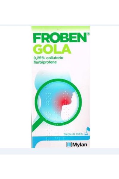 • FROBEN GOLA 0,25% Collutorio 100 ml di soluzione contengono: Principio attivo: Flurbiprofene 0,25 g. • FROBEN GOLA 0,25% Spray per mucosa orale 100 ml di soluzione contengono: Principio attivo: Flurbiprofene 0,25 g. Per l’elenco completo degli eccipienti, vedere paragrafo 6.1.