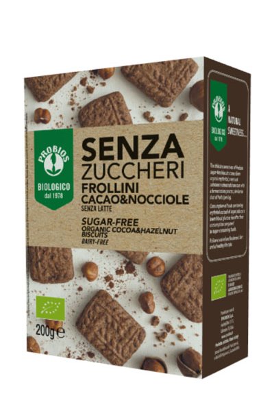 Frollini con cacao e nocciole, senza zuccheri, senza latte. Prodotto da forno con edulcorante. Senza olio di palma.