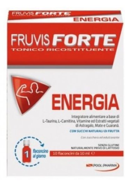 Fruvis forte "energia", innovativi flaconcini a base di vitamine, estratti vegetali, aminoacidi e succhi di frutta naturali concentrati (noni, papaya, lampone). Pratici da assumere a casa o fuori, senza glutine e lattosio, possono essere un valido aiuto nelle situazioni in cui la stanchezza psico-fisica si fa sentire di più, ai cambi di stagione, in caso di convalescenza, quando serve migliorare l'efficienza muscolare e il tono fisico. La niacina e l'acido pantotenico contribuiscono al normale metabolismo energetico, alla riduzione della stanchezza e dell'affaticamento. Le vitamina B6 e B12 favoriscono il buon funzionamento del sistema immunitario, del sistema nervoso e la normale funzione psicologica, la Riboflavina contribuisce alla protezione delle cellule dallo stress ossidativo. Gli e.s. di mate e guaranà hanno un'azione tonica in caso di stanchezza fisica e mentale, l'astragalo è un tonico-adattogeno, il succo concentrato di noni ha proprietà antiossidanti mentre il succo di papaya favorisce le naturali difese dell'organismo. Completano la formula L-taurina e L-carnitina che contribuiscono ad aumentare la resistenza alla fatica.