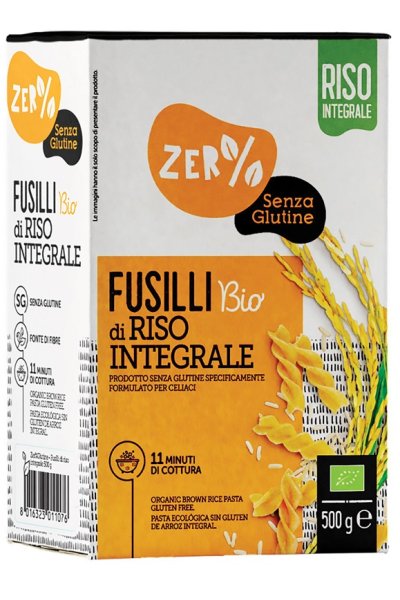 Pasta di riso semigreggio, formato fusilli senza glutine da agricoltura biologica.Il riso semigreggio è il riso comunemente chiamato integrale, ovvero liberato dalla lolla, il rivestimento più esterno del chicco non commestibile.