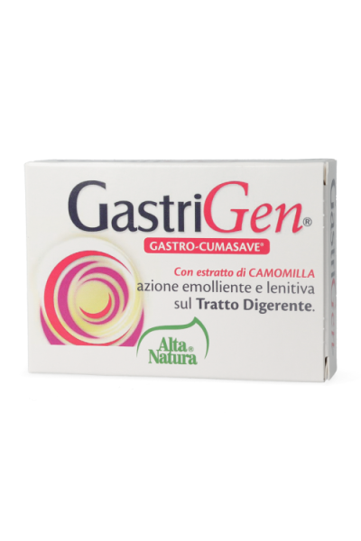 Integratore alimentare a base di Gastro-Cumasave, miscela esclusiva Alta Natura, composta da estratti secchi selezionati e standardizzati (Camomilla emolliente e lenitiva sul tratto digerente, Angelica e Melissa funzione digestiva, Curcuma ad azione antiossidante e Liquirizia regolarità del sistema digerente). Con Gastro-AD a base di Soia fermentata da Lactobacillus delbrueckii R-187 ed aggiunta di Saccharomyces Boulardii utili per favorire l'equilibrio della flora intestinale.
