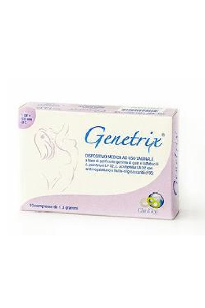 Dispositivo medico CE di classe I, in compresse ad uso vaginale.Genetrix è coadiuvante nel trattamento delle vaginosi batteriche (VB) soprattutto se sostenute da coliformi. L’utilizzo del gelificante muco aderente specifico gomma di guar è in grado di instaurare rapidamente, attraverso la formazione di un idrogel direttamente in vagina e dopo pochissimi minuti dalla disgregazione della compressa, un effetto barriera di tipo meccanico nei confronti di potenziali patogeni vaginali. In virtù delle sue proprietà mucoaderenti, inoltre, la gomma di guar riesce a garantire una benefica idrolubrificazione della vagina. La presenza, inoltre, dei due specifici microrganismi probiotici Lactobacillus plantarum LP02 e Lactobacillus acidophilus LA02, riequilibria la microflora vaginale ripristinando il "complesso di Doderlein" rinforzando di conseguenza ulteriormente il suddetto effetto barriera con meccanismi che si rivelano ancillari rispetto al gelificante. Oltre all’abbassamento del pH vaginale ad opera degli acidi organici prodotti dai due microrganismi, infatti, la sintesi di specifiche batteriolisine da parte del ceppo L. Plantarum LP02 concorre in misura peculiare alla formazione e al mantenimento di un microambiente vaginale sfavorevole all’instaurazione, propagazione o persistenza di un’infezione batterica. La presenza delle due fibre prebiotiche frutto-oligosaccaridi e arabinogalattano fornisce un nutrimento selettivo per i microrganismi della flora vaginale (complesso di Doderlein) ed i probiotici presenti in Genetrix favorendone quindi la capacità di colonizzazione dell’ecosistema vaginale, accorciando i tempi necessari per la sua efficacia. Può essere anche utilizzato nelle vaginosi e nei pruriti vulvari che richiedano il ripristino della normale microflora vaginale.