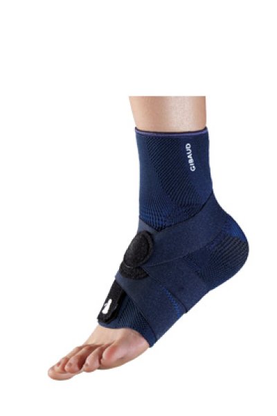 Come si indossa: infilare la cavigliera come un calzino in modo che il logo GIBAUD risulti sulla parte superiore della caviglia. Assicurarsi che i cuscinetti di protezione siano posizionati in corrispondenza dei malleoli. Applicare la benda elastica in corrispondenza del tassello in velluto presente sul dorso del piede.