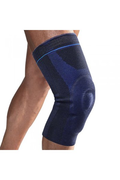 Indossare la ginocchiera posizionando il centraggio rotuleo in corrispondenza della rotula. Si consiglia di infilare la ginocchiera mantenendo rivoltato l’orlo siliconato all’altezza della linea blu di riferimento.