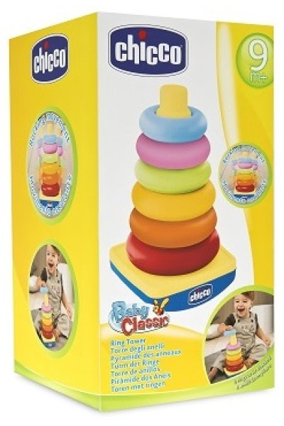 Una piramide colorata con 6 anelli di dimensioni differenti da infilare sulla base dal più grande al più piccolo: afferrando e impilando gli anelli, il bambino potrà sviluppare la coordinazione e il movimento delle mani.