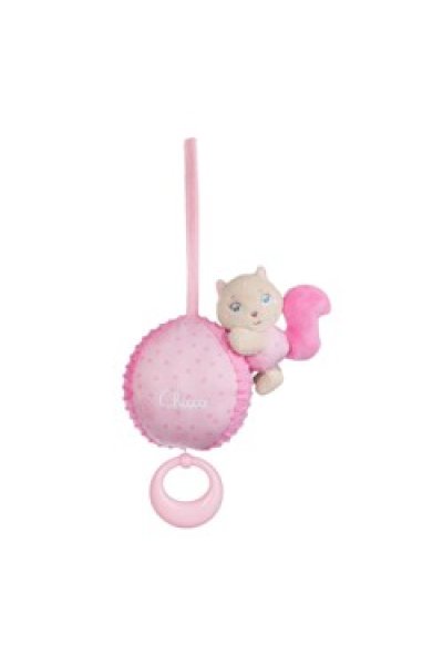 Carillon con un personaggio, uno scoiattolo. Con una fascetta può essere agganciato al lettino. Inoltre è contenuto all'interno di una confezione che può essere utilizzata per contenere calzine e vestitini del piccolo. Lavabile solo in superficie. Bigliettino di auguri compreso nella confezione. Colore: rosa.