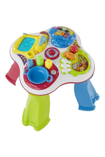 Tavolo bilingue con attività elettroniche, manuali e oggetti removibili, per stimolare il gioco creativo.