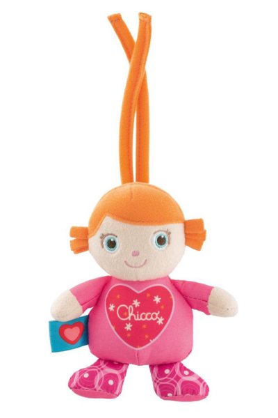 La bambola musicale Charlotte Chicco è dotata di pratiche cinghie per agganciarla rapidamente alla culla o al passeggino.