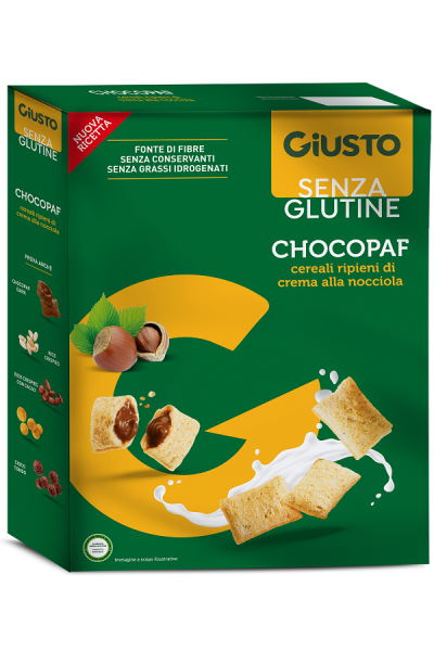 Cereali ripieni di crema alla nocciola. Fonte di fibre.