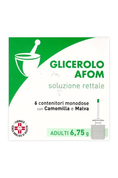 GLICEROLO AFOM prima infanzia 2,25 g soluzione rettale – 6 contenitori monodose con camomilla e malva Ogni contenitore monodose contiene: Principi attivi: Glicerolo 2,25 g GLICEROLO AFOM bambini 4,5 g soluzione rettale – 6 contenitori monodose con camomilla e malva Ogni contenitore monodose contiene: Principi attivi: Glicerolo 4,5 g GLICEROLO AFOM adulti 6,75 g soluzione rettale – 6 contenitori monodose con camomilla e malva Ogni contenitore monodose contiene: Principi attivi: Glicerolo 6,75 g Per l’elenco completo degli eccipienti vedere paragrafo 6.1.