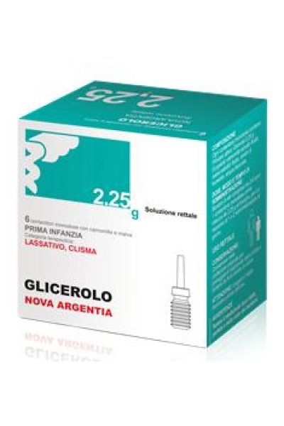 GLICEROLO NOVA ARGENTIA prima infanzia 2,25 soluzione rettale Ogni contenitore monodose contiene: principio attivo: Glicerolo 2,25 g. GLICEROLO NOVA ARGENTIA adulti 6,75 g soluzione rettale Ogni contenitore monodose contiene: principio attivo: Glicerolo 6,75 g. Per l’elenco completo degli eccipienti vedere paragrafo 6.1.
