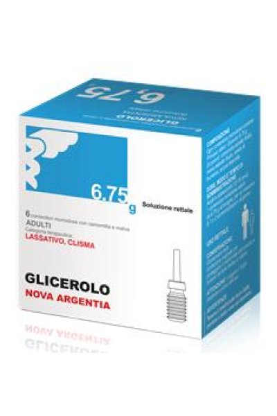 GLICEROLO NOVA ARGENTIA prima infanzia 2,25 soluzione rettale Ogni contenitore monodose contiene: principio attivo: Glicerolo 2,25 g. GLICEROLO NOVA ARGENTIA adulti 6,75 g soluzione rettale Ogni contenitore monodose contiene: principio attivo: Glicerolo 6,75 g. Per l’elenco completo degli eccipienti vedere paragrafo 6.1.