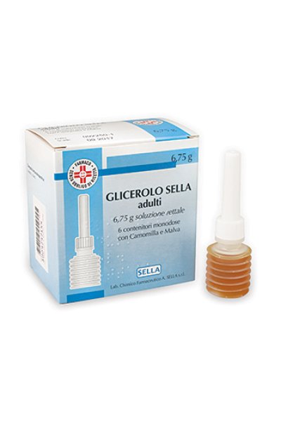 GLICEROLO SELLA prima infanzia 2,25 g soluzione rettale – 6 contenitori monodose con camomilla e malva Ogni contenitore monodose contiene: principi attivi: glicerolo 2,25 g GLICEROLO SELLA bambini 4,5 g soluzione rettale – 6 contenitori monodose con camomilla e malva Ogni contenitore monodose contiene: principi attivi: glicerolo 4,5 g GLICEROLO SELLA adulti 6,75 g soluzione rettale – 6 contenitori monodose con camomilla e malva Ogni contenitore monodose contiene: principi attivi: glicerolo 6,75 g Per l’elenco completo degli eccipienti vedere paragrafo 6.1.