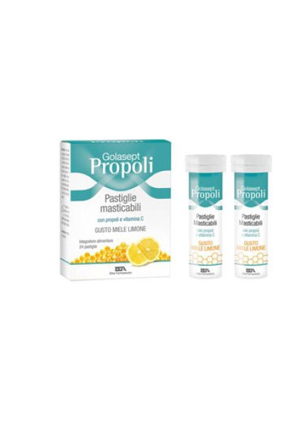 Golasept propoli pastiglie masticabili è formulata con propoli titolata in flavonoidi totali, vitamina C che contribuisce al normale funzionamento del sistema immunitario e completata da latte e miele.