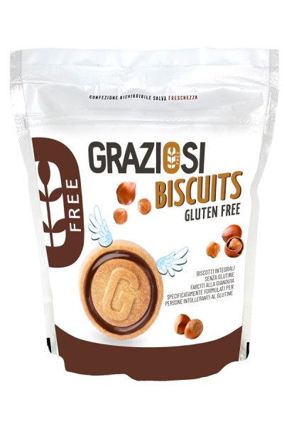 Biscotti integrali senza glutine farciti alla gianduia specificatamente formulati per persone intolleranti al glutine.