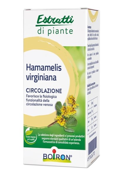 Integratore alimentare a base di estratti vegetali. Estratto idroalcolico. La corteccia e le foglie di Hamamelis virginiana favoriscono la fisiologica funzionalità della circolazione venosa (funzionalità del plesso emorroidario).