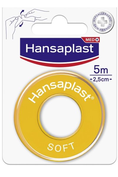 Cerotto su rocchetto Hansaplast Soft, un prodotto per il primo soccorso adatto alle pelli molto sensibili. Il cerotto permette il fissaggio di bende e compresse.