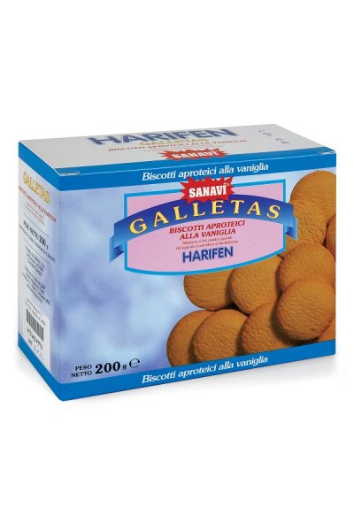Biscotti aproteici alla vaniglia preparati con ingredienti speciali, che hanno consentito di ottenere biscotti con un apporto ridottissimo di proteine ed aminoacidi, senza lattosio, con quantità controllate di sodio e potassio. Indicate nell'alimentazione di persone affette da insufficienza renale cronica, fenilchetonuria e altre aminoacidopatie.