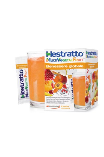 Concentrato di frutta e verdura, per favorire lo stato di benessere generale. Hestratto MultiVegetalFruit Benessere Globale, in pratiche bustine da sciogliere in acqua, apporta un concentrato disidratato di 8 diversi tipi di frutta e verdura (carota, zucca, mango, pera, albicocca, amarena, melograno, fragola), più e.s. di curcuma, vitamine, minerali e bifidobacterium lactis. In un attimo, permette di preparare una bevanda gradevole, sana e funzionale che preserva il naturale gusto e la fragranza della frutta e verdura presenti, mantenendo inalterate le proprietà nutrizionali di tutti gli ingredienti.