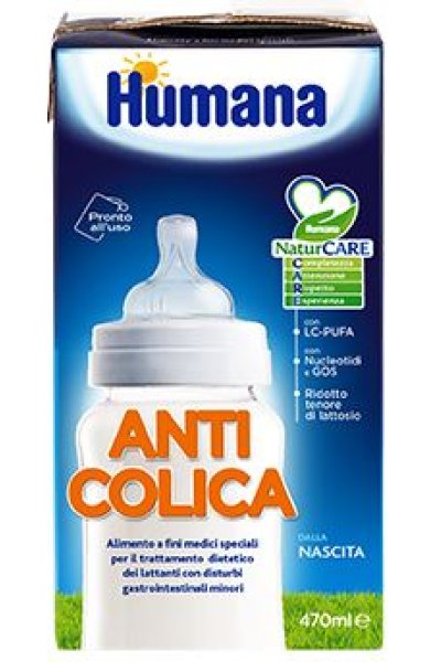 DescrizioneHumana Anticolica è un alimento a fini medici speciali per il trattamento dietetico dei lattanti con disturbi gastrointestinali minori, indicato come unica fonte nutrizionale nell'alimentazione del lattante dalla nascita fino al 6° mese compiuto. In caso di persistenza dei problemi gastroenterici dopo il 6° mese, Humana Anticolica può essere inserito nella dieta diversificata dello svezzamento, salvo diversa indicazione del Pediatra.