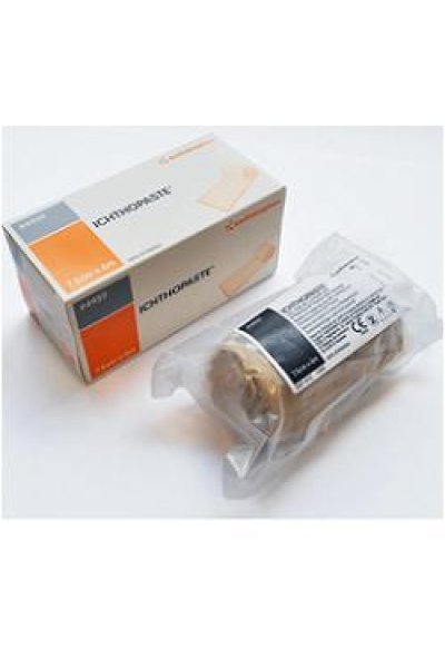 Dispositivo medico CE. Bendaggio compressivo con leggero cotone a trama aperta impregnato con pasta medicata all'ossido di zinco.Benda all'ossido di zinco e ittiolo studiata per il trattamento di ulcere essudative circondate da aree di pelle sensibile. Contiene ittiolo il quale decongestiona la pelle ed aiuta la guarigione delle ulcere. La benda Icthopaste è anche indicata per il trattamento di eczema varicoso e dermatite cronica.