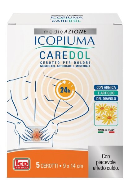 Dispositivo medico formulato e progettato per beneficiare dei suoi componenti naturali, quali arnica, artiglio del diavolo e salice, che svolgono un'azione protettiva delle aree del corpo affette da dolori muscolari, articolari, contratture di varia natura (dolori reumatici, traumi sportivi, torcicollo e lombalgie) e dolori mestruali. Inoltre, la presenza di vanillyl butyl ether dona una piacevole sensazione di calore. La speciale tecnologia garantisce l'azione di Caredol per 24 ore, mentre la durata dell'effetto caldo tende ad esaurirsi nell'arco di alcune ore.