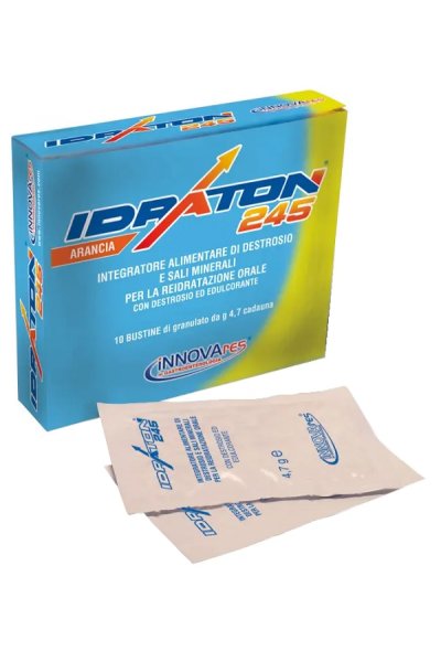 Soluzione reidratante orale (ORS) a bassa osmolarità (245 mOsm/l H2O), formulata secondo le indicazioni della World Health Organization (WHO) e dello United Nations International Children’s Emergency Fund (UNICEF). IDRATON 245 ® sfrutta l’esistenza di un sistema enterocitario di co-trasporto del sodio e del glucosio, che rimane intatto in corso di gastroenterite. Sia nelle diarree secretive sia in quelle osmotiche la funzionalità di questo sistema permette il passaggio di acqua dal lume intestinale all’enterocita e dall’enterocita al plasma, purché somministrata contemporaneamente a sodio e glucosio correttamente diluiti e nel corretto rapporto. Gusto arancia.Ingredienti e caratteristiche nutrizionali