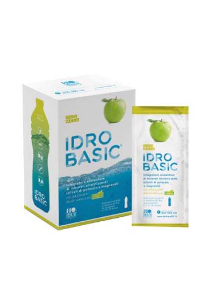 Integratore alimentare di minerali alcalinizzanti (citrati di potassio e magnesio), dolcificato con stevia. Ideale nel gestire e prevenire alcune patologie collegate alla disidratazione, e favorire una situazione di benessere derivante da un corretto equilibrio idrico dell'organismo. L'idropinoterapia è particolarmente importante in taluni soggetti sottoposti a forte disidratazione o ad aumentati fabbisogni: donne in gravidanza, atleti e sportivi in genere, bambini, anziani, pazienti affetti da calcoli renali, osteoporosi, dissenteria o in terapia con diuretici, lassativi e cortisonici. Idrobasic inoltre, apporta la giusta quantità di potassio e magnesio, al normale metabolismo energetico e alla normale funzione muscolare e ossea. Il tutto è stato realizzato utilizzando una miscela a bassissimo contenuto calorico (massimo 25 kcal per ogni bustina). Idrobasic ha una natura alcalina, infatti, essendo a base di citrato, è anche utile ad integrare una dieta povera di valenze alcaline (frutta e verdura) o compensare una dieta con elevato apporto di proteine o grassi che determinerebbero un eccessivo carico acido per l'organismo.