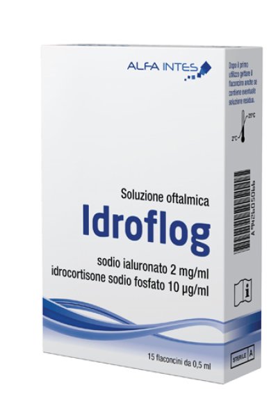 Soluzione oftalmica contenente sodio ialuronato che, grazie alle sue proprietà mucomimetiche e pseudoplastiche, si distribuisce uniformemente sulla superficie oculare formando un bendaggio viscoelastico protettivo. In tal modo, esplicando un’azione meccanica (“effetto barriera”), IDROFLOG stabilizza il film lacrimale e riduce l’attrito causato dai movimenti oculari e dall’ammiccamento, protegge la superficie dell’occhio favorendo i processi di riparazione conseguenti a sofferenza delle cellule dell’epitelio corneale dovuta ad una iposecrezione del film lacrimale. Infatti, nei casi in cui le ghiandole deputate alla secrezione del film lacrimale riducono - per diversi fattori - la loro normale attività, la superficie corneale rimane esposta maggiormente agli insulti esterni. Questi ultimi, nel tempo, provocano un mal funzionamento delle cellule epiteliali corneali con associato il rischio di insorgenza di fastidiosi processi infiammatori. L’applicazione del bendaggio IDROFLOG permette di proteggere la superficie corneale dall’esposizione agli insulti esterni e, grazie all’azione ancillare dell‘Idrocortisone Sodio Fosfato (agente cortisonico a basso dosaggio, basso potere antiinfiammatorio e breve durata d’azione), contribuisce a prevenire il rischio di eventuali recidive di fenomeni infiammatori.