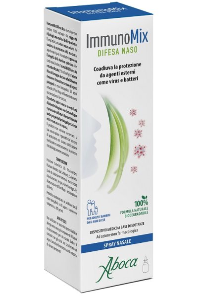 ImmunoMix Difesa Naso è un dispositivo medico 100% naturale che supporta i fisiologici meccanismi di difesa del naso. Forma, infatti, uno strato muco-adesivo che coadiuva la protezione della mucosa da agenti esterni quali virus e batteri e preserva l’integrità della barriera epiteliale delle cavità nasali. Inoltre, l’osmolalità bilanciata e standardizzata (750 mOsm/Kg) e l’azione fisica di lavaggio aiutano a fluidificare e rimuovere il muco in eccesso e gli agenti patogeni in esso intrappolati. Gli aromi naturali di pino mugo e menta conferiscono una sensazione di freschezza. Il prodotto agisce con un meccanismo d’azione fisiologico e non farmacologico e può essere utilizzato frequentemente anche per periodi prolungati perché non irrita e non secca la mucosa. Il prodotto non contiene conservanti: la sua conservazione è garantita dal processo di produzione con sistema di filtrazione sterilizzante e confezionamento in ambiente microbiologicamente controllato.