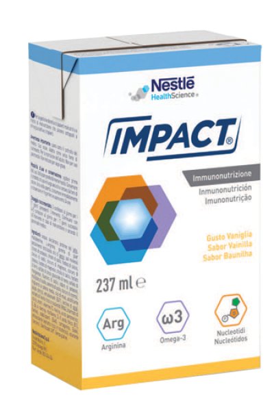 Impact Oral è disponibile in pratica confezione tripack, contenente 3 brick da 237 ml, corrispondenti al dosaggio giornaliero della terapia immuno-nutrizionale preoperatoria.