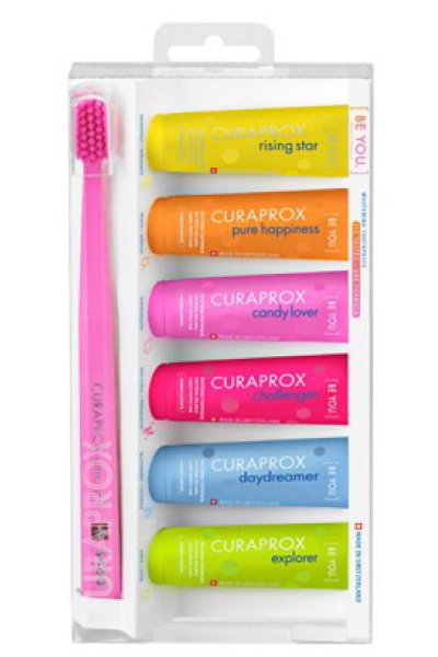 Pack che contiene i 6 gusti di dentifricio della linea BE YOU con uno spazzolino.