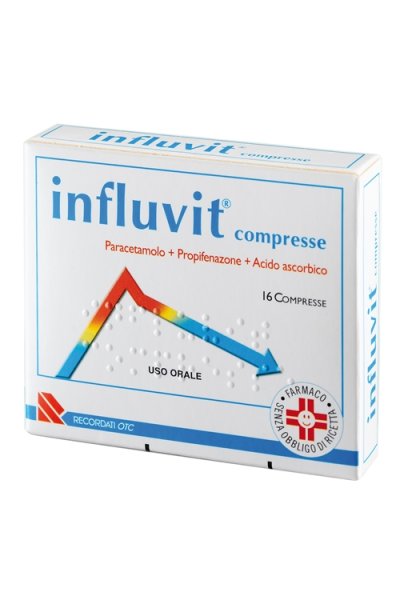 Effetti indesideratiCon l’uso di paracetamolo sono stati segnalati effetti indesiderati generalmente rari e lievi. Alterazioni del sangue e sistema linfatico: trombocitopenia, leucopenia, anemia, agranulocitosi, neutropenia. Alterazioni del sistema immunitario: sono state segnalate reazioni di ipersensibilità quali shock anafilattico. Alterazioni dell’apparato uditivo e vestibolare: vertigini. Patologie cardiache e Patologie vascolari: edema, ipertensione e insufficienza cardiaca sono state riportate in associazione al trattamento con FANS. Studi clinici e dati epidemiologici suggeriscono che l’uso di alcuni FANS (specialmente ad alti dosaggi e per trattamenti di lunga durata) può essere associato ad un modesto aumento del rischio di eventi trombotici arteriosi (p.es. infarto del miocardio o ictus) (vedere paragrafo 4.4). Patologie gastrointestinali: gli eventi avversi più comunemente osservati sono di natura gastrointestinale; possono verificarsi reazioni gastrointestinali, ulcere peptiche, perforazione o emorragia gastrointestinale, a volte fatale, in particolare negli anziani (vedere paragrafo 4.4). Alterazioni del sistema epatobiliare: alterazioni della funzionalità epatica ed epatiti. Alterazioni della cute e del tessuto sottocutaneo: sono state osservate reazioni cutanee di vario tipo e gravità, inclusi casi di eritema multiforme e reazioni bollose comprese sindrome di Stevens–Johnson e necrolisi epidermica tossica (molto raramente). Nell’ambito di reazioni di ipersensibilità sono stati segnalati rash cutaneo od orticaria, angioedema e edema della laringe. Alterazioni renali e delle vie urinarie: insufficienza renale acuta, nefrite interstiziale, ematuria, anuria. Qualora durante il trattamento comparissero ripresa della febbre, angina, alterazioni della cute o delle mucose, sospendere la terapia e consultare il medico. Per il propifenazone vi sono state alcune segnalazioni di gravi reazioni di ipersensibilità; inoltre è stato associato ad attacchi acuti di porfiria. L’acido ascorbico è generalmente ben tollerato. Dopo somministrazione di Influvit sono stati riportati: nausea, vomito, diarrea, flatulenza, costipazione, dispepsia, dolore addominale ed epigastrico, pirosi gastrica, melena, ematemesi, stomatiti ulcerative, esacerbazione di colite e morbo di Crohn (vedere paragrafo 4.4). Meno frequentemente sono state osservate gastriti. Segnalazione delle reazioni avverse sospette La segnalazione delle reazioni avverse sospette che si verificano dopo l’autorizzazione del medicinale è importante, in quanto permette un monitoraggio continuo del rapporto beneficio/rischio del medicinale. Agli operatori sanitari è richiesto di segnalare qualsiasi reazione avversa sospetta tramite il sistema nazionale di segnalazione all’indirizzo www.agenziafarmaco.gov.it/it/responsabili