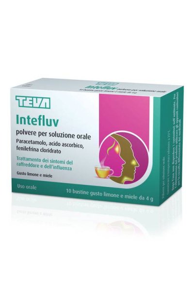 AvvertenzeDurante il trattamento con paracetamolo, prima di assumere qualsiasi altro farmaco controllare che non contenga lo stesso principio attivo, poiché se il paracetamolo è assunto in dosi elevate si possono verificare gravi reazioni avverse. I prodotti a base di paracetamolo devono essere somministrati con cautela a pazienti con insufficienza epatocellulare da lieve a moderata (compresa la sindrome di Gilbert), insufficienza epatica grave, epatite acuta, in trattamento concomitante con farmaci che alterano la funzionalità epatica. Invitare il paziente a contattare il medico prima di associare qualsiasi altro farmaco (vedere anche la sezione 4.5). È sconsigliato l’uso del prodotto se il paziente è in trattamento con antiinfiammatori. Non somministrare per oltre 3 giorni consecutivi senza consultare il medico. INTEFLUV contiene saccarosio: i pazienti affetti da rari problemi ereditari di intolleranza al fruttosio, da malassorbimento di glucosio-galattosio o da insufficienza di sucrasi-isomaltasi non devono assumere questo medicinale. INTEFLUV contiene circa 23 mg di sodio per bustina equivalente all’1,15% dell’assunzione massima giornaliera raccomandata dall’OMS che corrisponde a 2 g di sodio per un adulto.