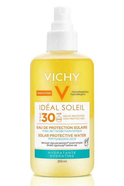Texture acquosa innovativa – ultra leggera, ultra fresca. Acqua solare con alta protezione dai raggi UV che lascia una sensazione di freschezza, non appiccicosa e senza effetto bianco. Questa formula è arricchita con acido ialuronico di origine naturale per idratare la pelle e stimolarne la luminosità. La formula, composta dal 3% di glicerina dalle proprietà idratanti e dallo 0,1% di vitamina E, è arricchita con acido ialuronico per idratare la pelle. La speciale tecnologia contenuta all'interno è composta da una fase acquosa e una fase oleosa in cui sono presenti i filtri UVA, UVB e UVA lunghi. Il risultato è uno spray trasparente che non lascia residui e dona una sensazione di fresco. Ipoallergenico. Per pelle sensibile, testato sotto controllo dermatologico.