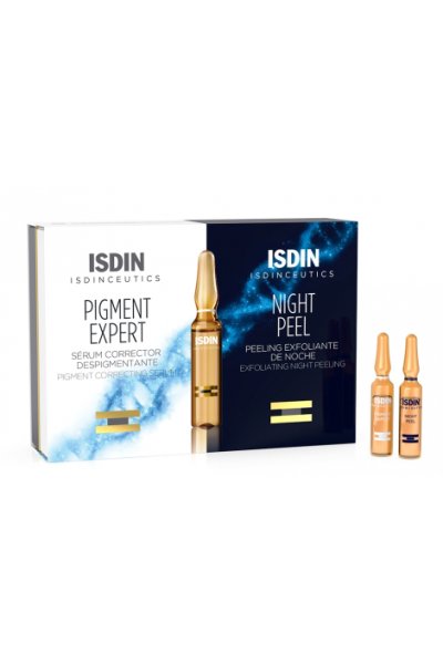 Trattamento anti-macchie. Contiene fiale da giorno Isdin Pigment Expert e fiale da notte Isdinceutics Night Peel.