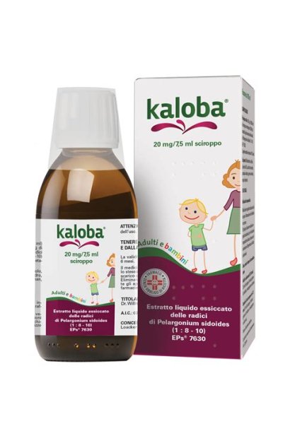 PosologiaPosologia Adulti e adolescenti di età superiore ai 12 anni: 7,5 ml di sciroppo (corrispondenti a 20 mg di estratto di pelargonio) 3 volte al giorno. Bambini di età superiore ai 6 anni: 5 ml di sciroppo (corrispondenti a circa 13 mg di estratto di pelargonio) 3 volte al giorno. La durata massima del trattamento è di 7 giorni. Popolazioni speciali Non sono disponibili informazioni su pazienti con compromissione epatica e renale. Popolazione pediatrica La sicurezza e l’efficacia di KALOBA nei bambini di età inferiore ai 6 anni non sono state ancora stabilite. Modo di somministrazione Il bicchiere dosatore annesso alla confezione presenta diversi segni di taratura. Lo sciroppo può essere bevuto direttamente dal dosatore o trasferito su un cucchiaio.