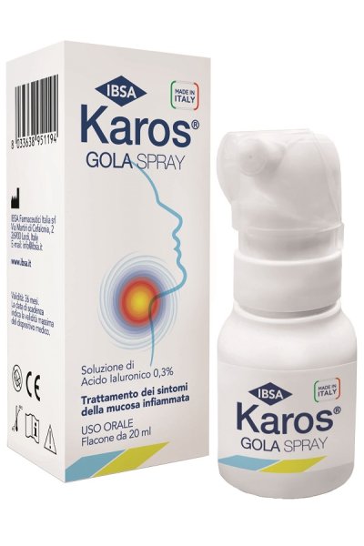 Karos spray orale è una soluzione a base di acido ialuronico da nabulizzare in gola in caso di flogosi mucosa le orofaringea (infiammazione della mucosa orile e faringea).