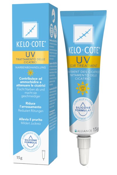 Kelo-cote UV è un dispositivo medico CE di classe I.Gel di siliconi appositamente studiato e brevettato per la protezione di cicatrici ipertrofiche e cheloidee recenti e di vecchia data dagli effetti nocivi del sole, proteggendole allo stesso tempo grazie all'azione dei filtri solari.
