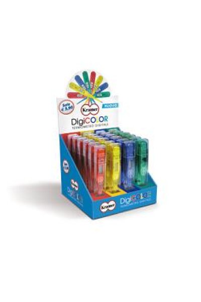Digicolor nuovo termometro digitale, trasparente, in 4 diversi colori, blu, giallo, rosso, verde. Con batteria sostituibile senza mercurio e senza cadmio. Dimensioni: cm 15(L) x 15(P) x 27,5(H) E' un dispositivo medico CE 0197.