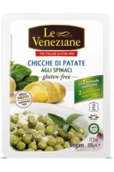 Patate reidratate 70% (acqua, fiocchi di patate, emulsionanti: mono e digliceridi degli aciid grasis, aromi), farina di mais, fecola di patate, amido di mais, spinaci 3%, farina di riso, sale, correttore di aciidtà: acido lattico, conservante: acido sorbico.