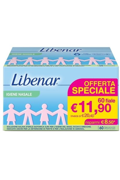 Soluzione salina sterile isotonica allo 0,9% in flaconcini monouso per l'igiene del naso, occhi e orecchie.