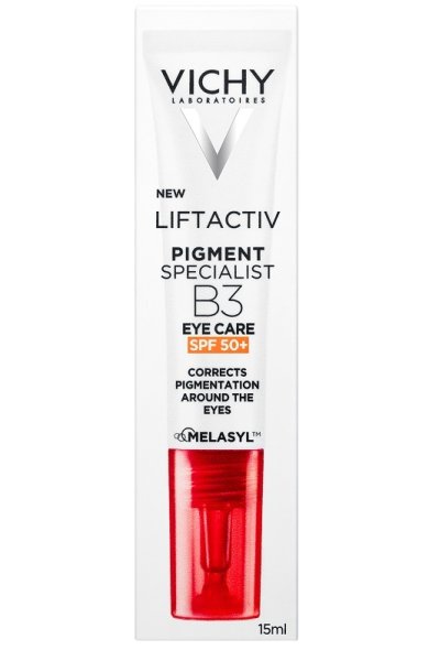 : Il contorno occhi Liftactiv Pigment Specialist B3 agisce su occhiaie e pigmentazione con niacinamide B3, Melasyl, e protezione SPF 50+.