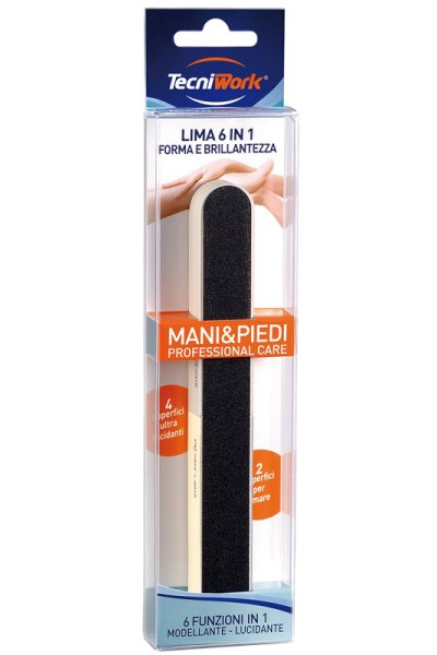Lima modellante e lucidante che, grazie alle 6 diverse superfici, è perfetta per ridurre la lunghezza delle unghie (lima nera), modellarne la forma (lima bianca) e lucidare la superficie con le 4 facce di grana diversa da usare in successione.