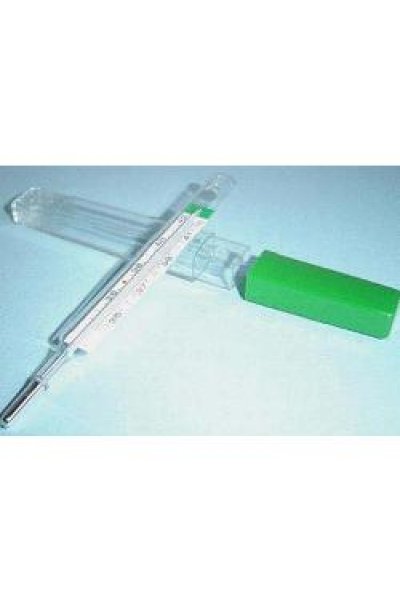 Termometro completo di astuccio di plastica trasparente e cappuccio colorato verde.