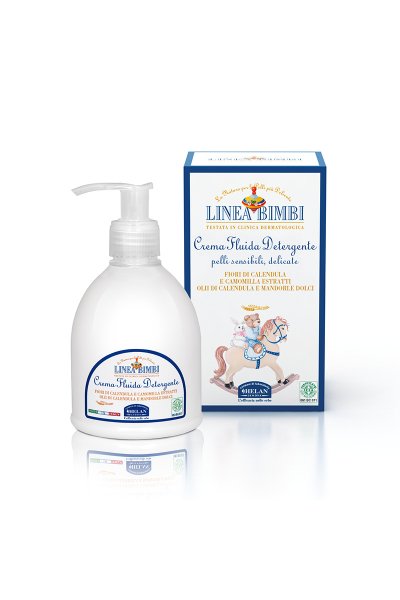 Crema fluida detergente che si avvale dell'attività addolcente e calmante degli estratti di fiori di Calendula e Camomilla e delle proprietà emollienti e nutrienti degli olii estratti dalla stessa Calendula e dalle Mandorle dolci per detergere delicatamente la cute dei bambini, senza alterarne il naturale equilibrio idro-lipidico, quando arrossamenti e irritazioni sconsigliano l'uso dell'acqua.