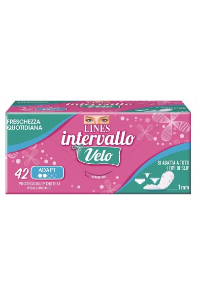 Scoprire la gamma Lines Intervallo Velo, i proteggislip Lines creati per donare una straordinaria sensazione di freschezza durante tutto il giorno, così confortevoli da non sentirli addosso. L'incredibile flessibilità di Lines Intervallo Velo garantisce il massimo del comfort in un solo millimetro di spessore. Grazie alle fibre superassorbenti il prodotto ti assicura, inoltre, la protezione di cui c'è bisogno.